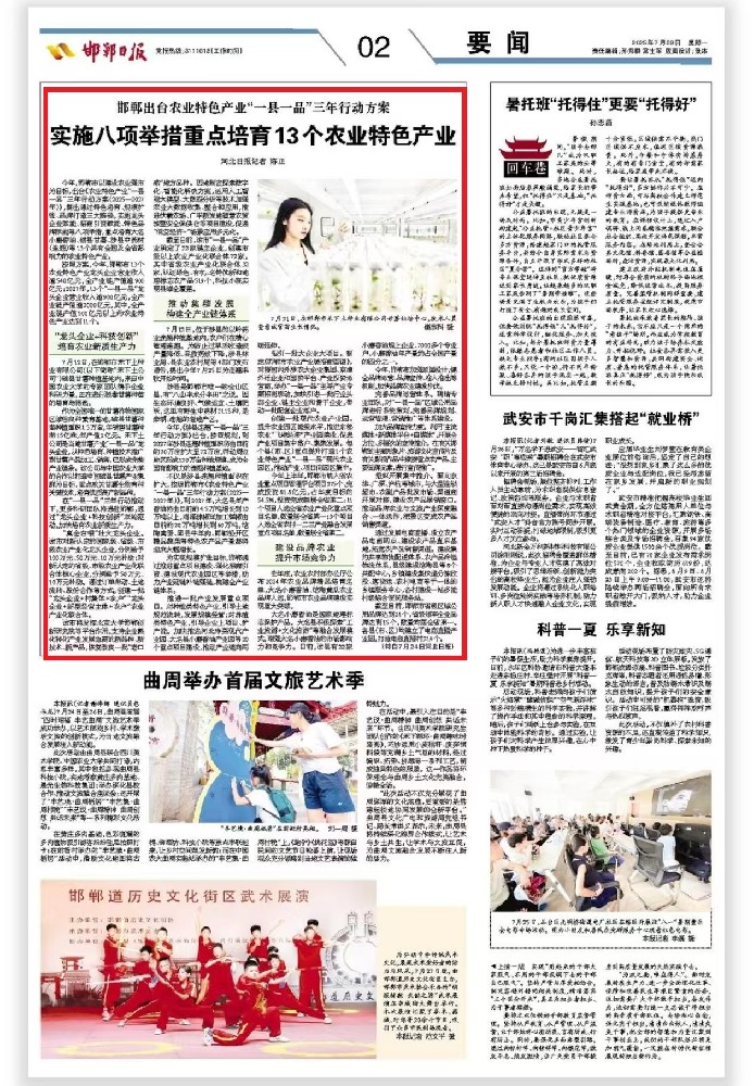 2025年7月28日,繼河北日報之后,邯鄲日報刊登《實施八項舉措重點培育13個農(nóng)業(yè)特色產(chǎn)業(yè)》,聚焦邯鄲農(nóng)業(yè)特色產(chǎn)業(yè)“一縣一品”三年行動方案。邯鄲市禾下土種業(yè)有限公司作為全國唯一的甘薯作物國家區(qū)域性良種繁育基地,磁縣甘薯種苗種植面積1.5萬畝,年銷售甘薯種苗15億株,年產(chǎn)值2億元。禾下土公司是當(dāng)?shù)馗适懋a(chǎn)業(yè)”一縣一品”龍頭企業(yè),從種苗培育、種植技術(shù)推廣到甘薯產(chǎn)品加工、銷售,已形成完整產(chǎn)業(yè)鏈條。與中國農(nóng)業(yè)大學(xué)的合作以打造中國磁縣甘薯產(chǎn)業(yè)集群為目標(biāo),重點攻關(guān)甘薯生物育種關(guān)鍵技術(shù),培育優(yōu)質(zhì)高產(chǎn)新品種。在“一縣一品”三年行動推動下,更多科研團(tuán)隊將進(jìn)駐邯鄲,通過“龍頭企業(yè)+科技創(chuàng)新”雙輪驅(qū)動,加快培育農(nóng)業(yè)新質(zhì)生產(chǎn)力。