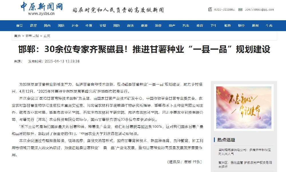 2025年4月14日,新華網(wǎng)客戶(hù)端發(fā)布《河北磁縣:甘薯產(chǎn)業(yè)迎來(lái)“智囊團(tuán)” 科技賦能“一縣一品”》的報(bào)道。本次論壇的召開(kāi),旨在加快發(fā)展甘薯種業(yè)新質(zhì)生產(chǎn)力,促進(jìn)甘薯育種技術(shù)創(chuàng)新,推動(dòng)磁縣甘薯種業(yè)“一縣一品”規(guī)劃建設(shè),助力鄉(xiāng)村振興。為加快發(fā)展甘薯種業(yè)新質(zhì)生產(chǎn)力,促進(jìn)甘薯育種技術(shù)創(chuàng)新,推動(dòng)磁縣甘薯種業(yè)“一縣一品”規(guī)劃建設(shè),助力鄉(xiāng)村振興。4月12日,“2025年甘薯種業(yè)創(chuàng)新發(fā)展高峰論壇”在河北省邯鄲市磁縣舉行。本次活動(dòng)邀請(qǐng)國(guó)家甘薯產(chǎn)業(yè)技術(shù)研發(fā)中心、中國(guó)作物學(xué)會(huì)甘薯專(zhuān)業(yè)委員會(huì)、農(nóng)業(yè)農(nóng)村部甘薯生物學(xué)與生物技術(shù)重點(diǎn)實(shí)驗(yàn)室、河北省農(nóng)科院糧油作物研究所等甘薯作物領(lǐng)域權(quán)威專(zhuān)家參加。研討會(huì)通過(guò)專(zhuān)題報(bào)告解讀、現(xiàn)場(chǎng)觀摩、座談交流、 合作簽約等形式,圍繞甘薯育種技術(shù)創(chuàng)新、新品種選育與登記、 脫毒健壯種苗繁育技術(shù)研究與推...
