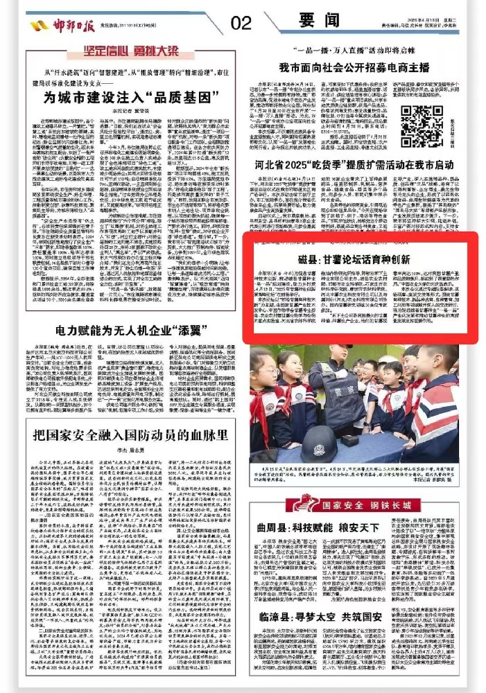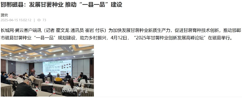 2025年4月15日,邯鄲日?qǐng)?bào)發(fā)布題為《磁縣:甘薯論壇話育種創(chuàng)新》的報(bào)道,此次論壇的召開(kāi),旨在促進(jìn)甘薯育種技術(shù)創(chuàng)新,推動(dòng)磁縣甘薯種業(yè)“一縣一品”規(guī)劃建設(shè),助力鄉(xiāng)村振興。