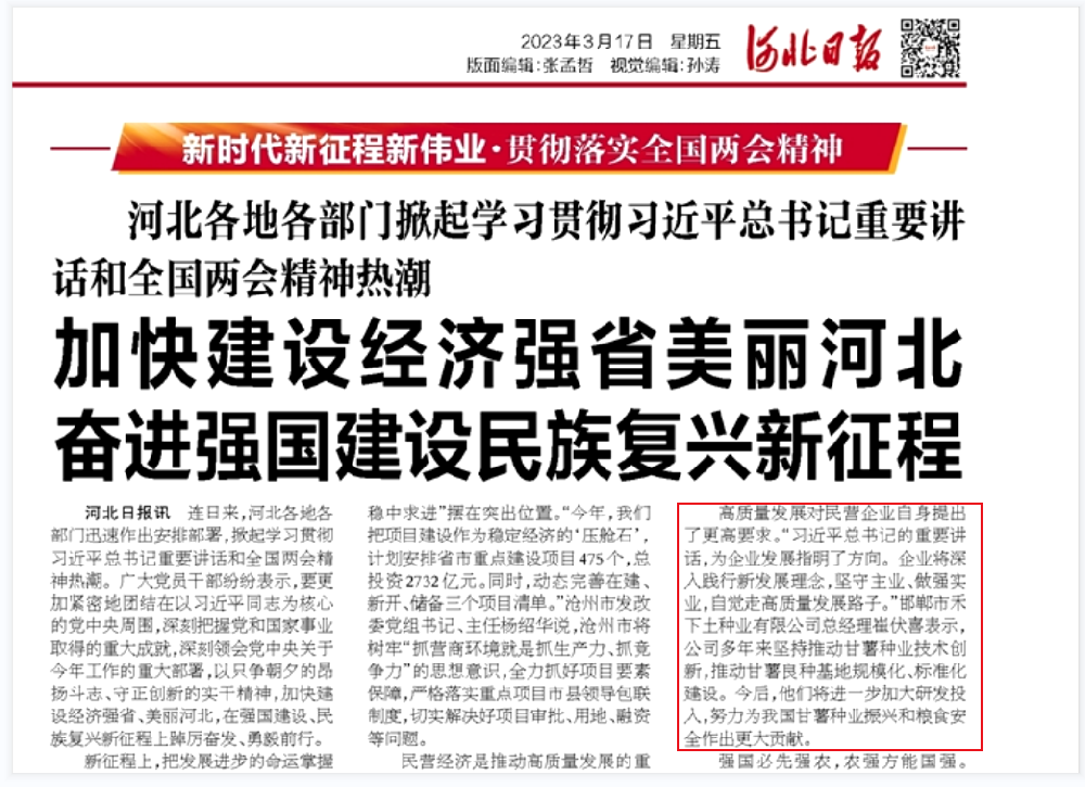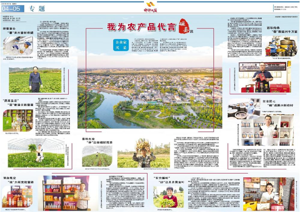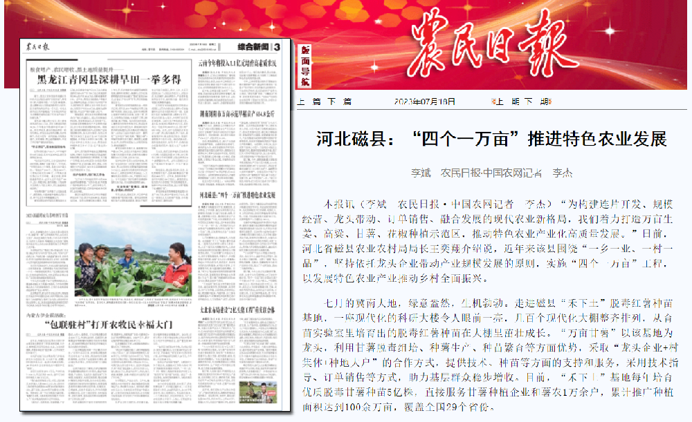 2023年7月18日,《農(nóng)民日報》刊登“河北磁縣:‘四個一萬畝’推進(jìn)特色農(nóng)業(yè)發(fā)展”,關(guān)注磁縣脫毒甘薯等4大特色農(nóng)業(yè)產(chǎn)業(yè)高質(zhì)量發(fā)展。