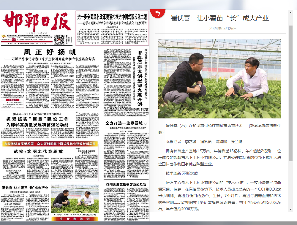 2024年6月7日,邯鄲日報專題《我為農(nóng)產(chǎn)品代言 磁縣篇》刊登“甜蜜事業(yè),‘薯’育共富新希望”。邯鄲市禾下土種業(yè)有限公司總經(jīng)理崔伏喜扎根土地,創(chuàng)新進(jìn)取、銳意開拓,以生物脫毒技術(shù)為依托,大力發(fā)展脫毒薯苗產(chǎn)業(yè),推進(jìn)育種基地、組培基地、種薯基地、育苗基地“四位一體”規(guī)模化建設(shè),建立起6個規(guī)模化甘薯良繁基地,年產(chǎn)種苗10余億株,年產(chǎn)值1.5億元,公司成功入選全國甘薯作物國家種業(yè)陣型企業(yè)。同時致力于培育地方特色農(nóng)業(yè)品牌,帶動群眾增收致富,推動鄉(xiāng)村經(jīng)濟(jì)振興,彰顯當(dāng)代企業(yè)家精神風(fēng)貌。