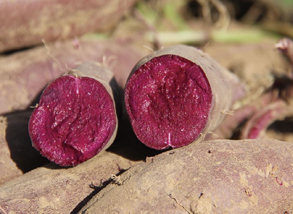 鮮食型甘薯品種,中長薯,數塊條形,薯皮紫紅色,薯肉紫色,結薯集中整齊,干物率33.44%,鮮薯花青素含量為20.46mg/100g??垢适砺畈 ⒏ ⒑诎卟?,耐儲存性好。一般畝產鮮薯2000公斤左右。